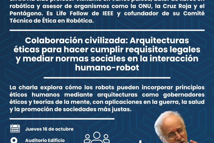Nos complace invitarle a la charla titulada "Colaboración civilizada: Arquitecturas éticas para hacer cumplir requisitos legales y mediar normas sociales en la interacción humano-robot", impartida por el Dr. Ronald Arkin. Esta charla forma parte del grupo de Interés en Inteligencia Artificial.