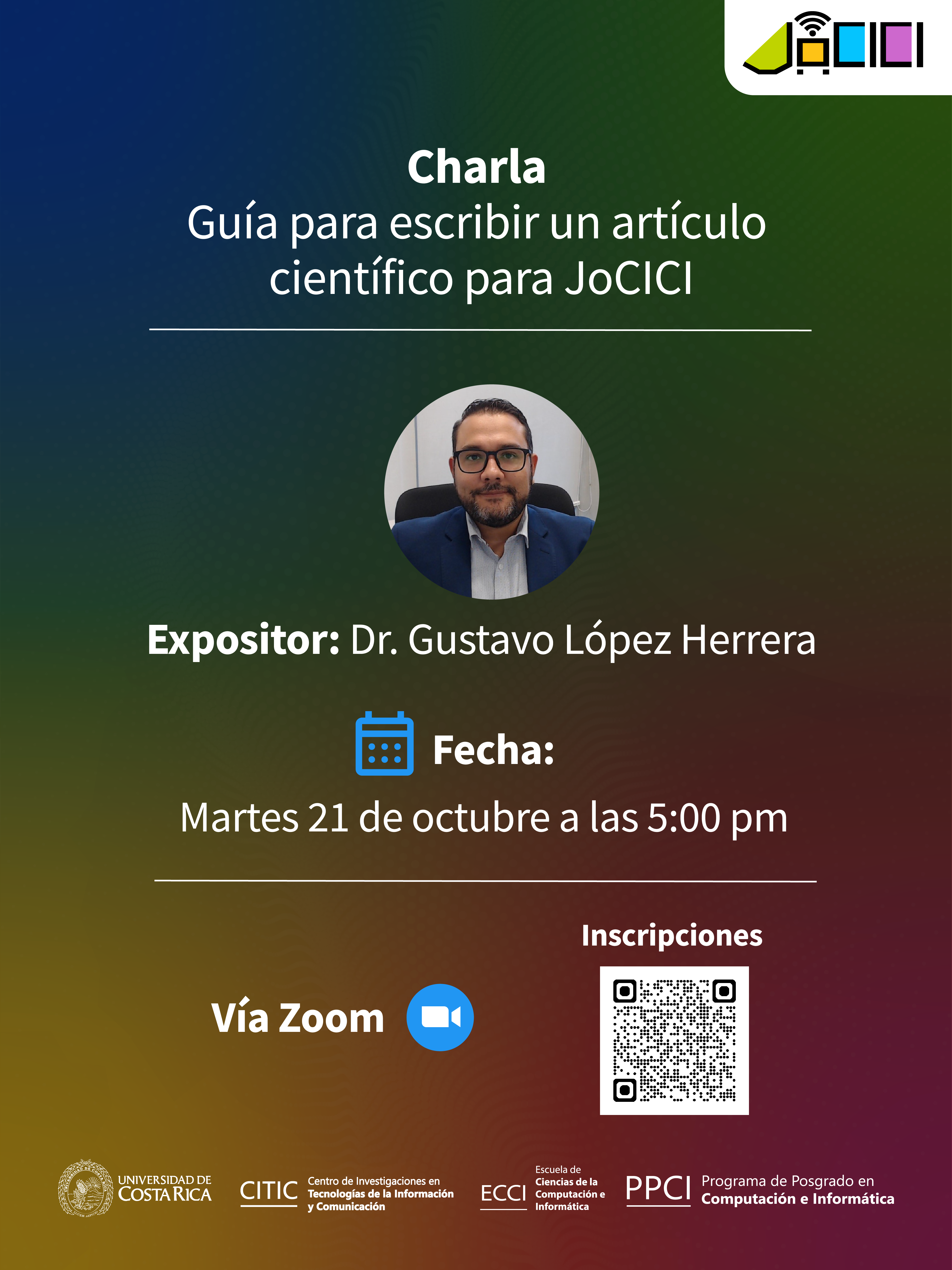 Nos complace invitarle a la charla titulada "Guía para escribir un artículo científico para JoCICI", impartida por el Dr. Gustavo López Herrera.