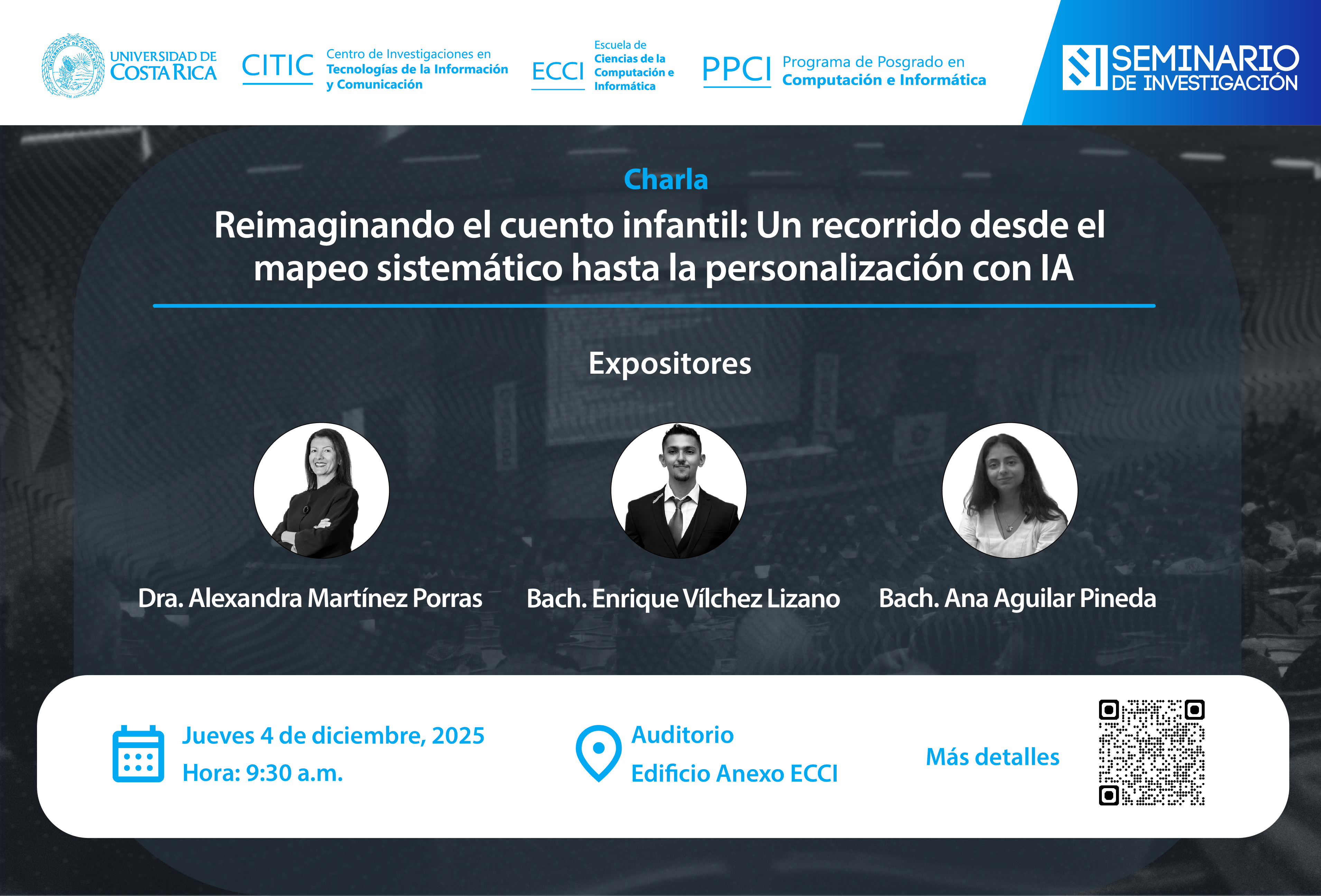 Nos complace invitarle a la charla titulada "Reimaginando el cuento infantil: Un recorrido desde el mapeo sistemático hasta la personalización con IA", impartida por la Dra. Alexandra Martínez Porras, Bach. Enrique Vílchez Lizano y Bach. Ana Aguilar Pineda. Esta charla forma parte de nuestro Seminario de Investigación y además será transmitida en vivo a través de Youtube.