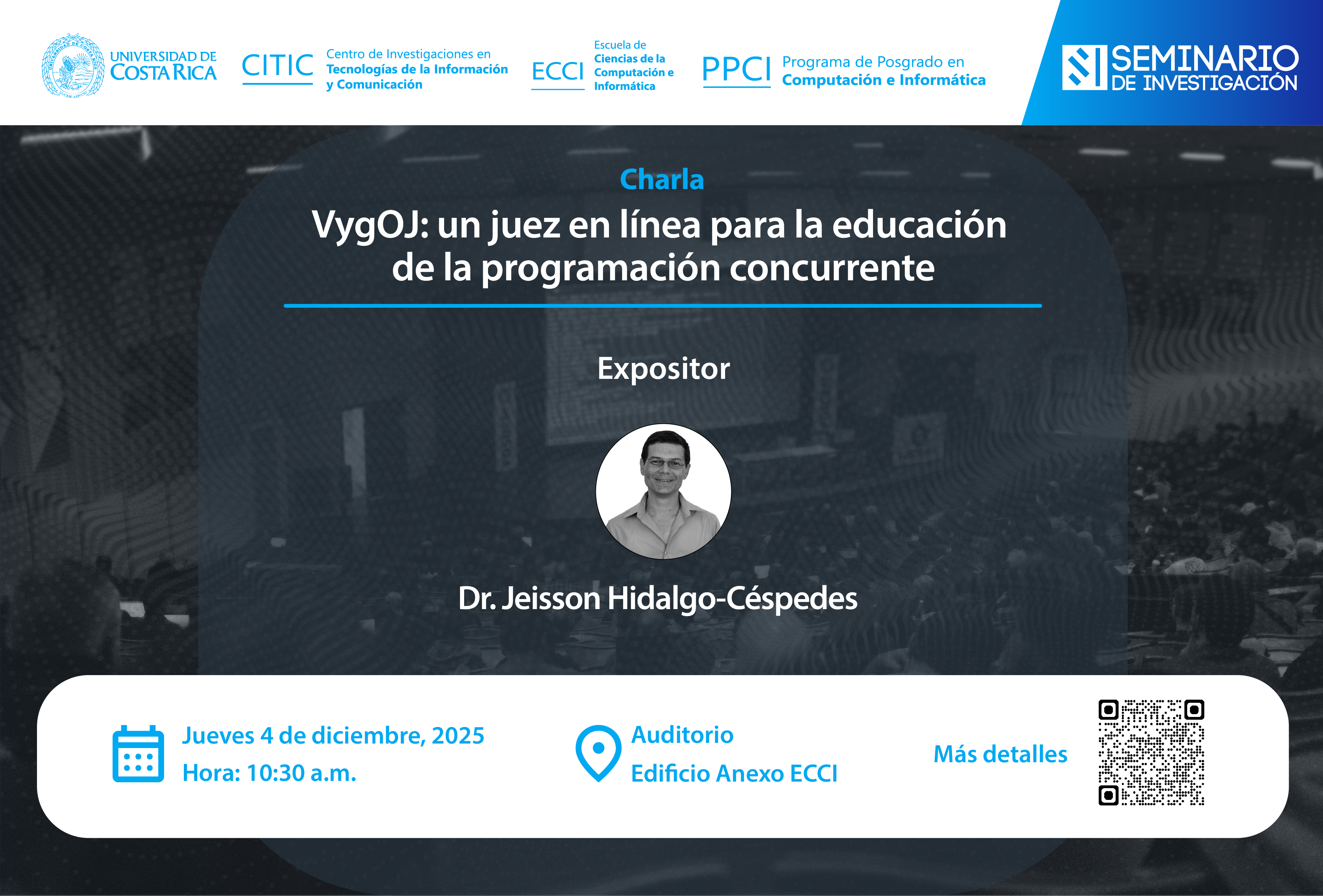 Nos complace invitarle a la charla titulada "VygOJ: un juez en línea para la educación de la programación concurrente", impartida por el Dr. Jeisson Hidalgo-Céspedes. Esta charla forma parte de nuestro Seminario de Investigación y además será transmitida en vivo a través de Youtube.