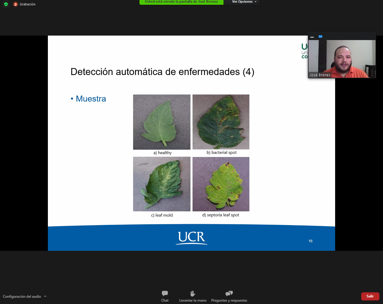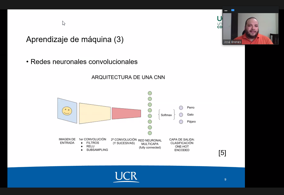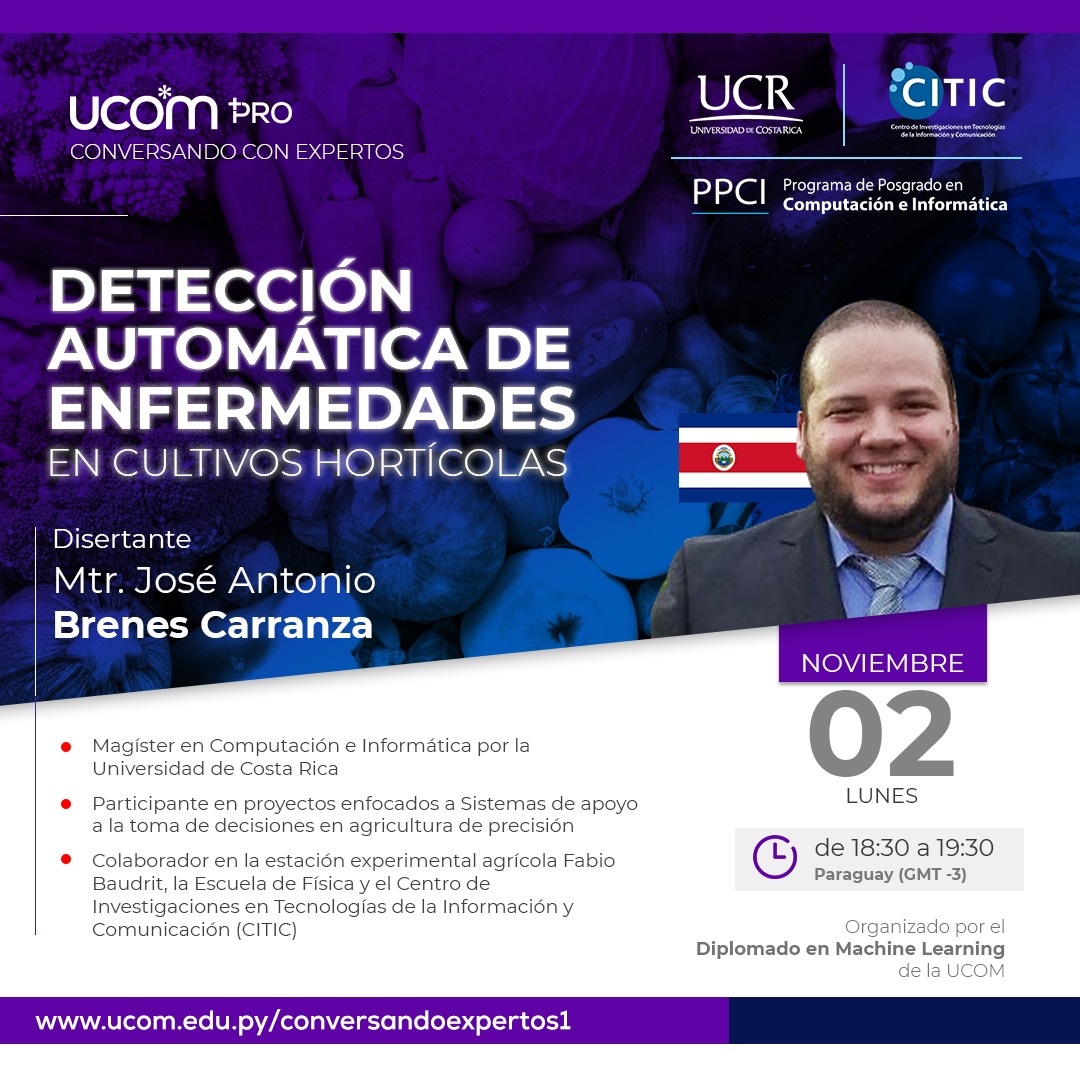 El pasado Lunes 02 de noviembre del 2020, el investigador Mag. Jose Antonio Brenes Carranza impartió la charla "Detección automática de enfermedades en cultivos hortícolas" por medio de la plataforma Zoom. La actividad fue organizada por el diplomado en Machine Learning de la Universidad Comunera de Paraguay.